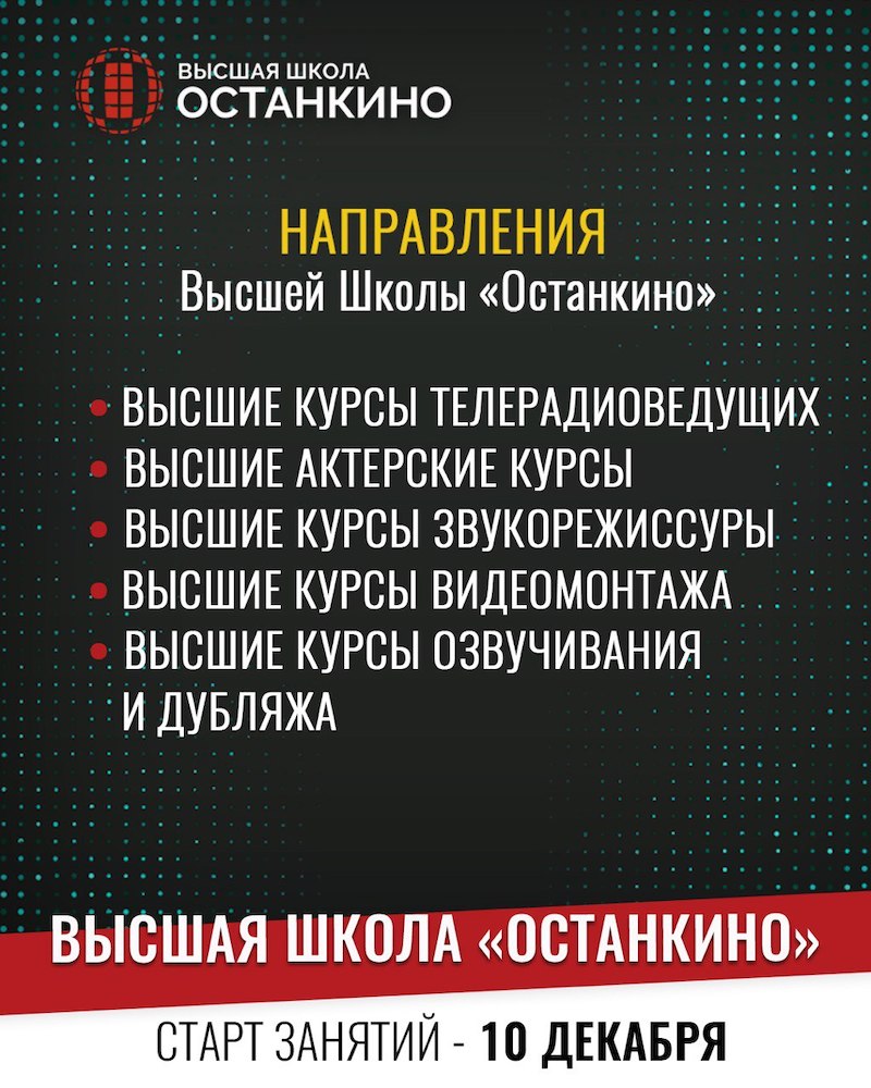 Успешно заявить о себе в медиасфере, создать новый имидж, усовершенствовать навыки, необходимые для успешной работы с аудиторией не только в рамках сферы медиа, но и в других областях: бизнес, менеджемент, продажи и пр. – все это можно получить в Высшей Школе Кино и Телевидения «Останкино».
